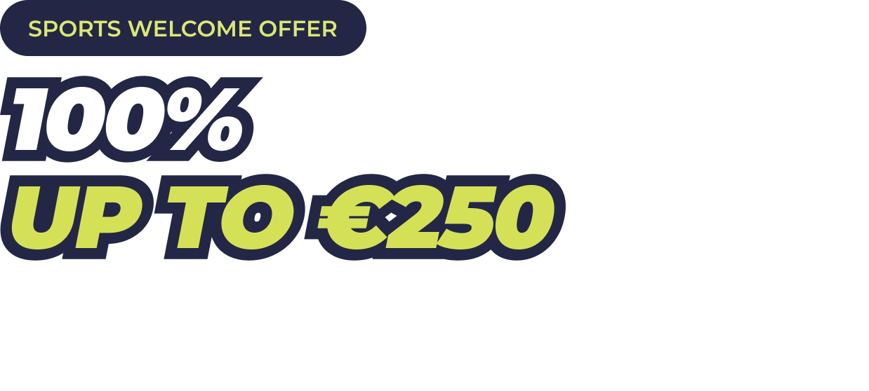 GamblingCare.ie. 18+. Play Responsibly. New customers only. 100% Bonus up to €250. Min deposit €100. Wager 10x at min odds 1.7 within 30 days. Wagering only with bonus funds. Max transferable winnings after wagering: €1000. T&Cs Apply.